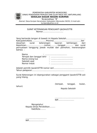 Surat keterangan ini dipergunakan sebagai pengganti ijazah/sttb asli yang hilang surat kehilangan ijazah. Jika kehilangan ijazah, maka lampirkan surat pengantar dari dinas .